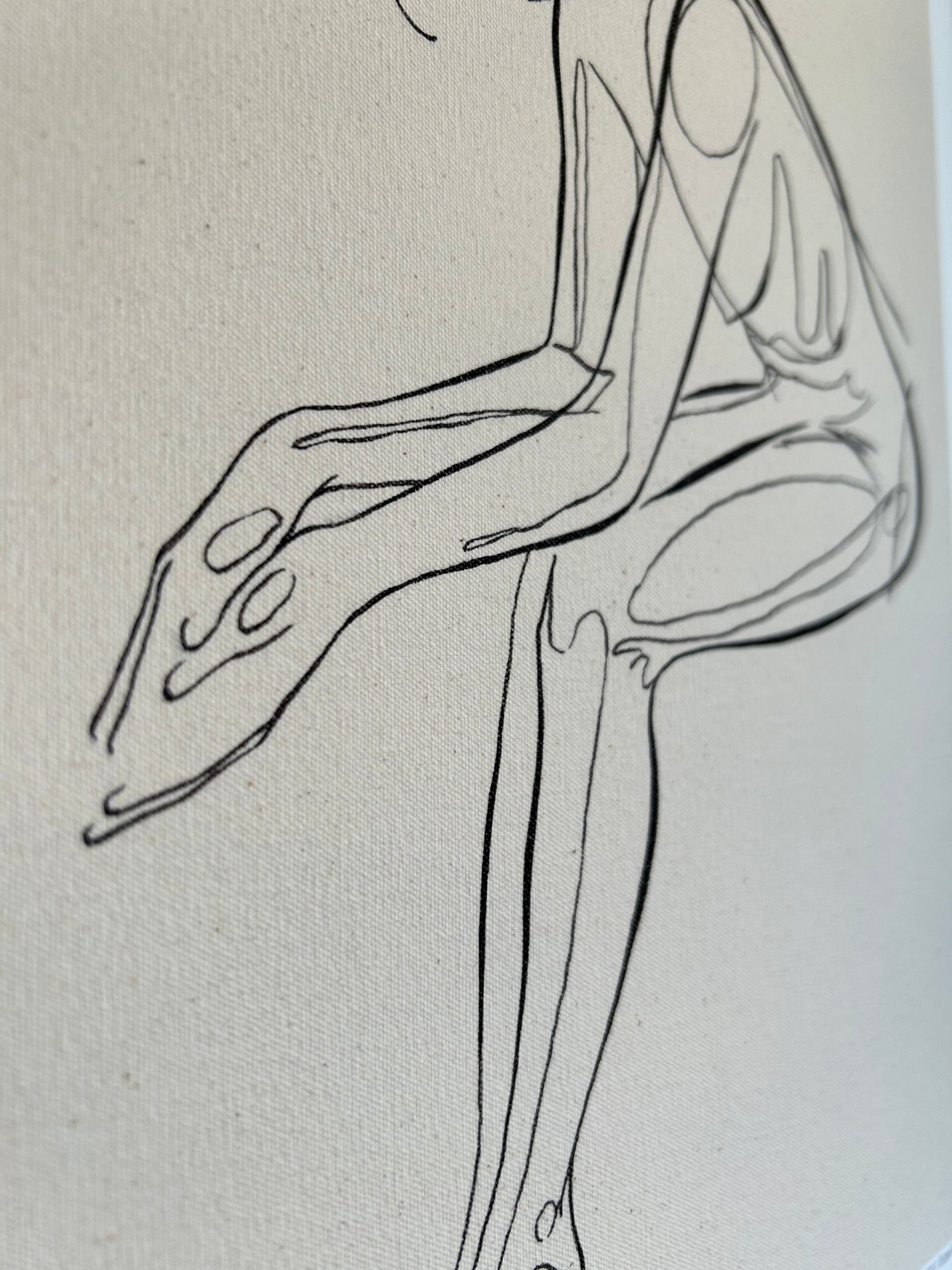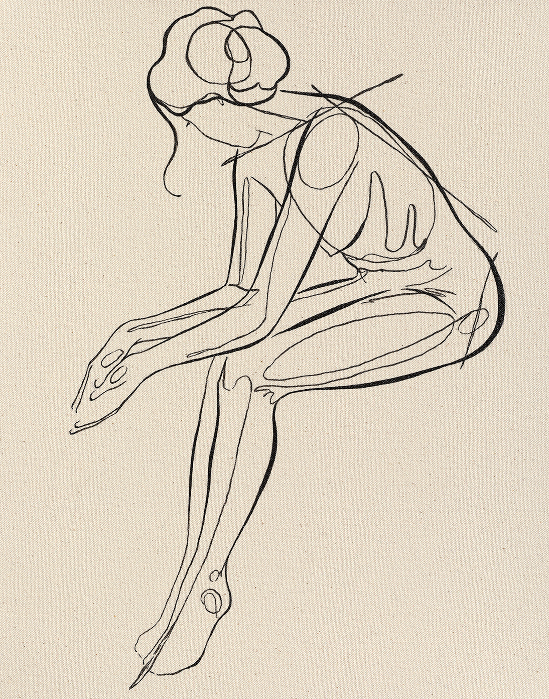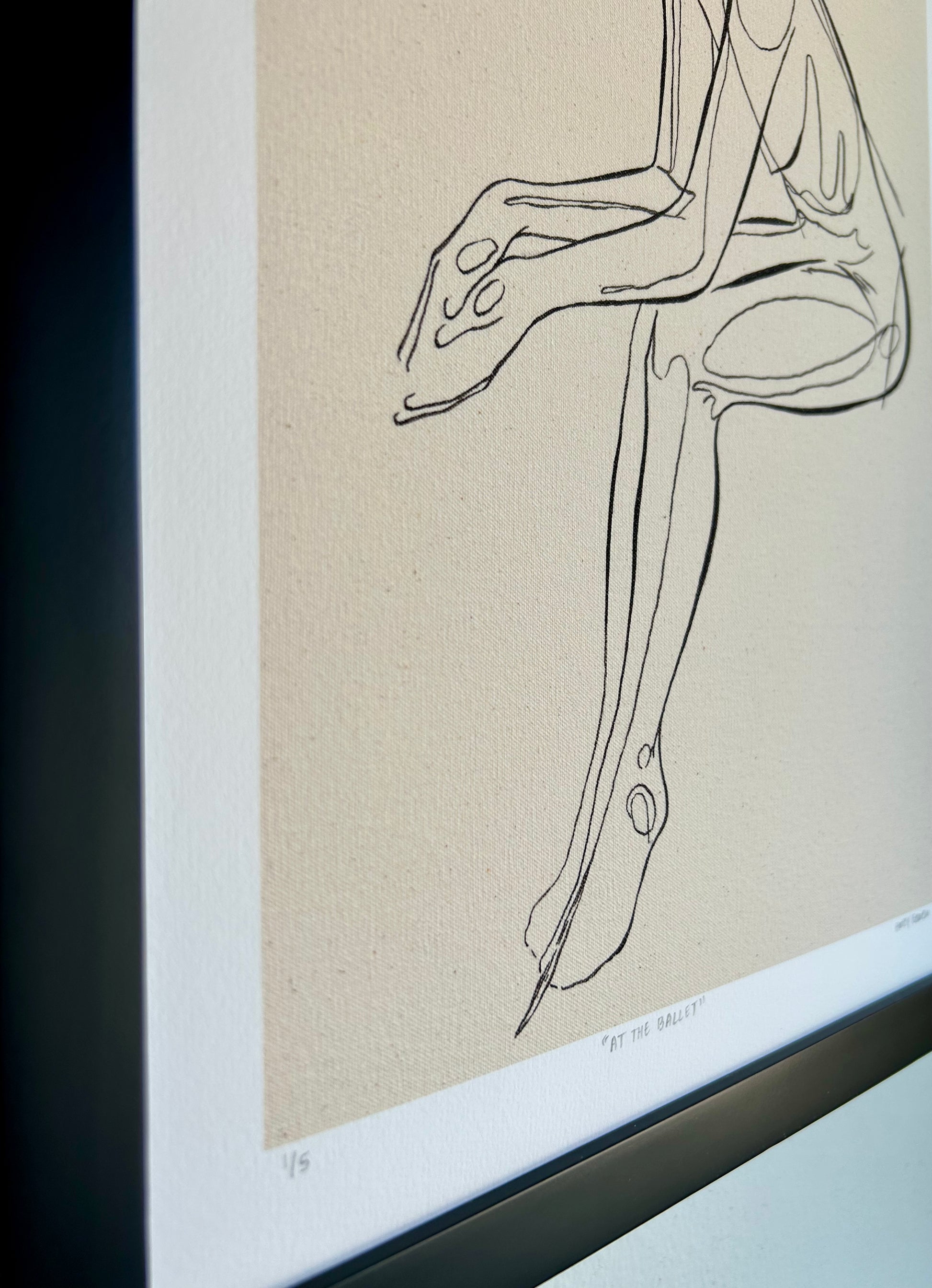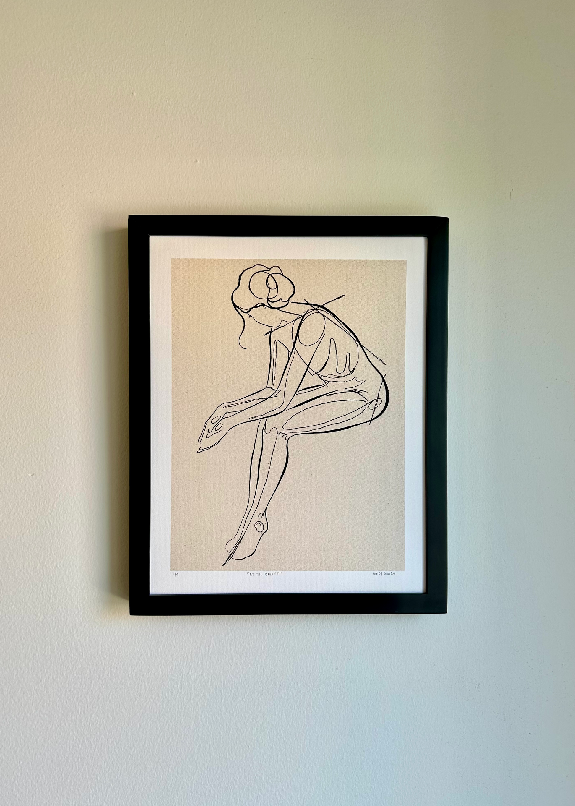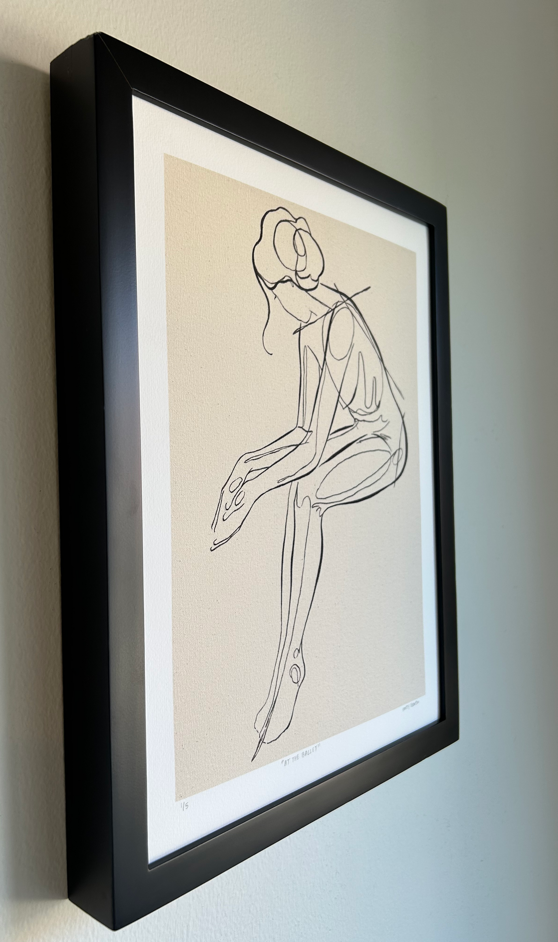 "At the Ballet" is a reproduction of an original watermedia painting on handmade canvas. The figure sits patiently behind the scenes of her performance, paying homage to the dancers of Degas.
