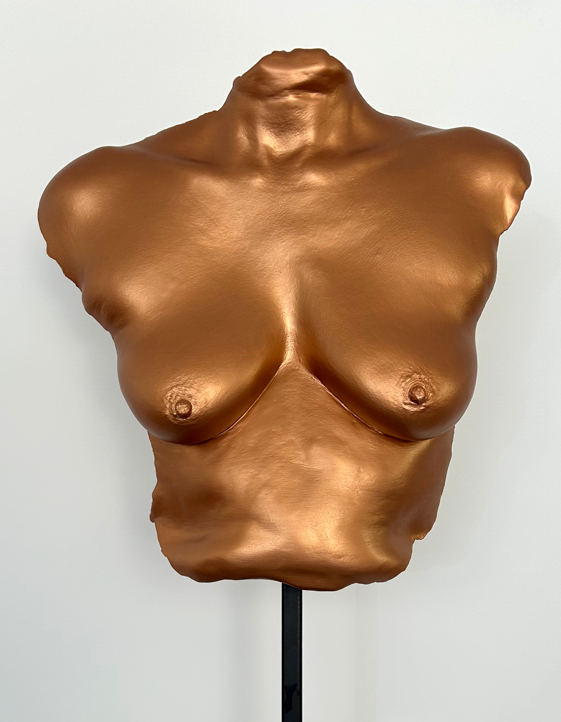 Breast Cast, 2025, copper pigment and mixed media welded to contemporary black metal stand, commissioned work.