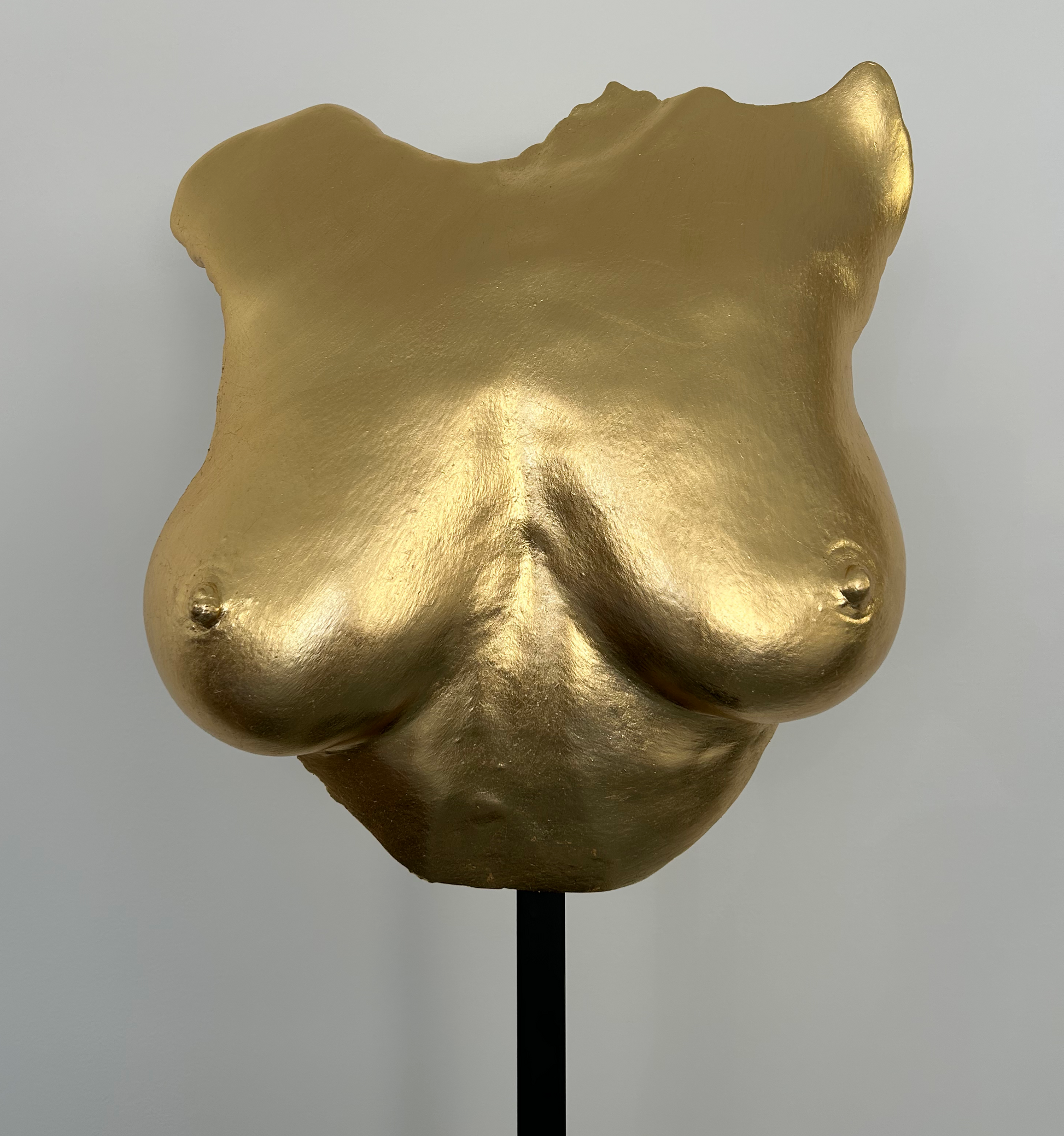 Breast Cast, 2025, gold leaf and mixed media welded to contemporary black metal stand, commissioned work.